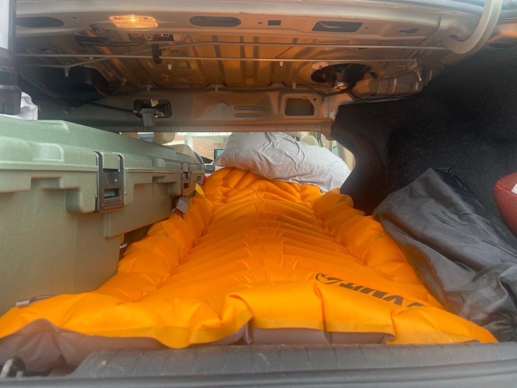 The goal while packing was to leave enough space for two additional travel companions and deter criminals from breaking in. I am still not sure if people would be less likely to break in if they see that someone is clearly living in their car, or if most of my valuables are hidden in the trunk. Would I look homeless and therefore have less to steal if my bed was out? I’ll be sure to poll local crime syndicates along the way to see what they think. In day mode, most of my things are more difficult to access. Converting to my sleep setup took around 10 minutes and required opening every door and the trunk.