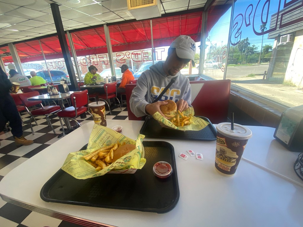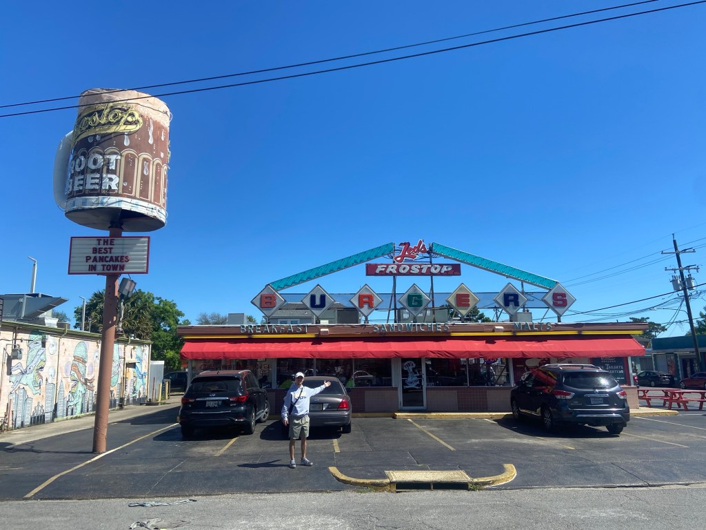 On the Jumbotron at a Pelicans game. Peeling crawfish for dinner. Ted’s Frostop in New Orleans, LALot-O-Burger and Rootbeer